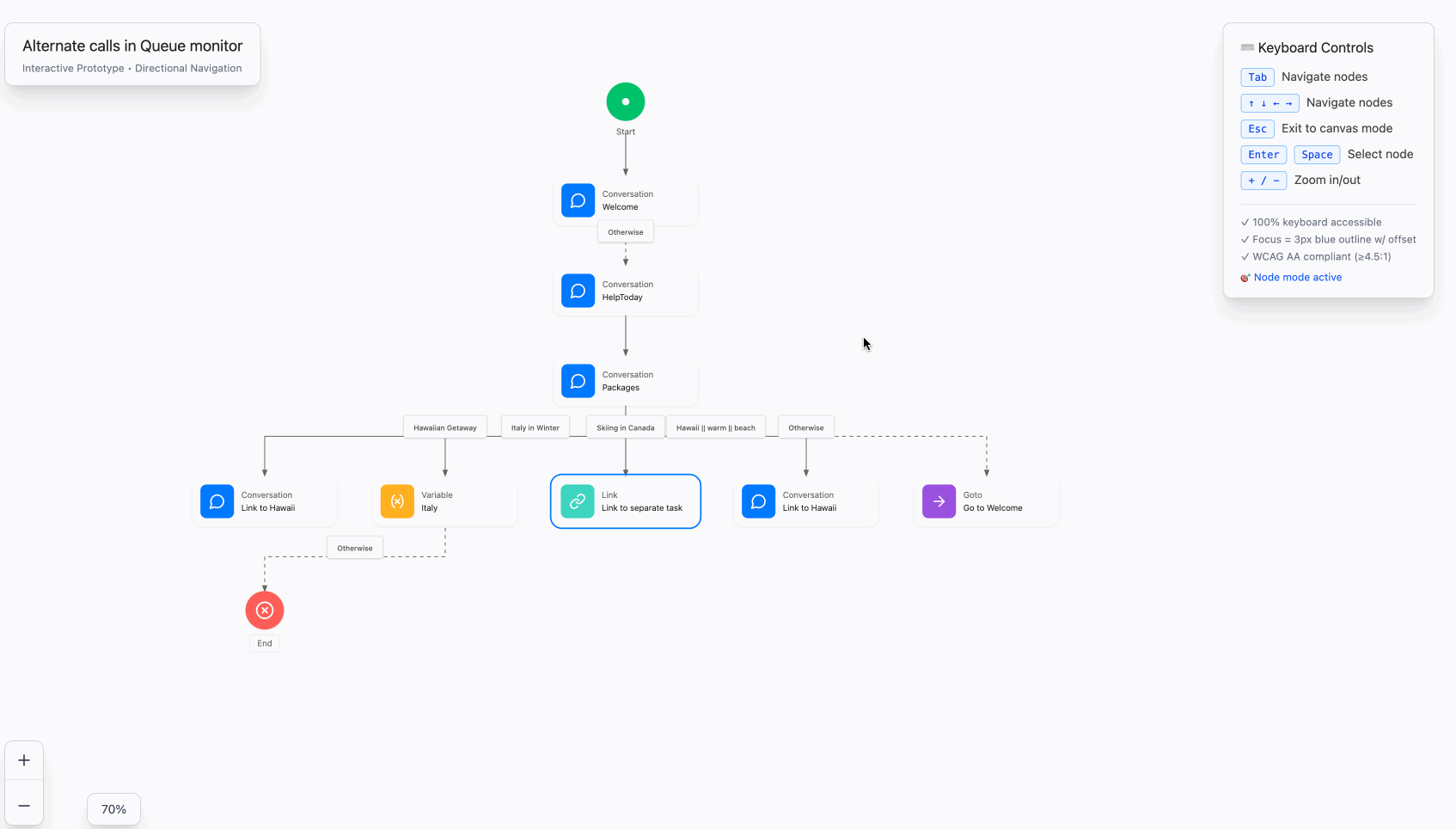 One of the limitations of the standard ‘Tab’ input for keyboard-only navigation is you need to make a lot of assumptions about hierarchy and Tab ordering. For a typical website this is acceptable but for a completely visual flow builder I felt this would be too restrictive.